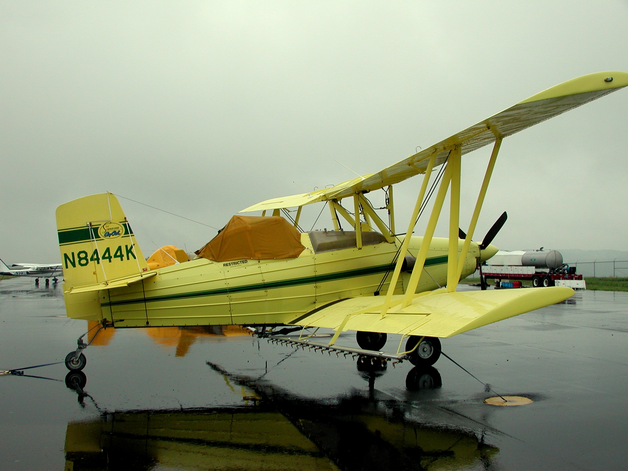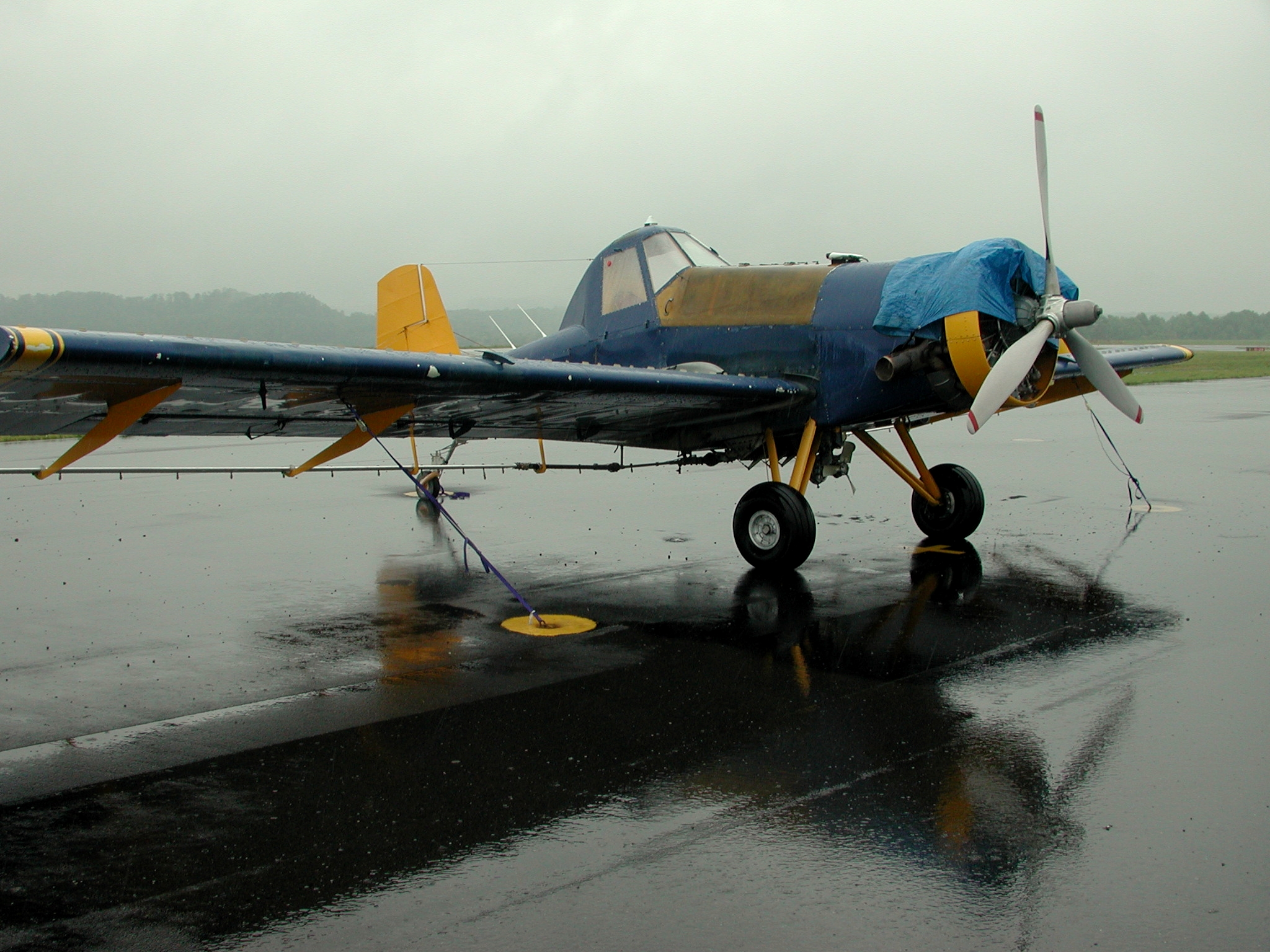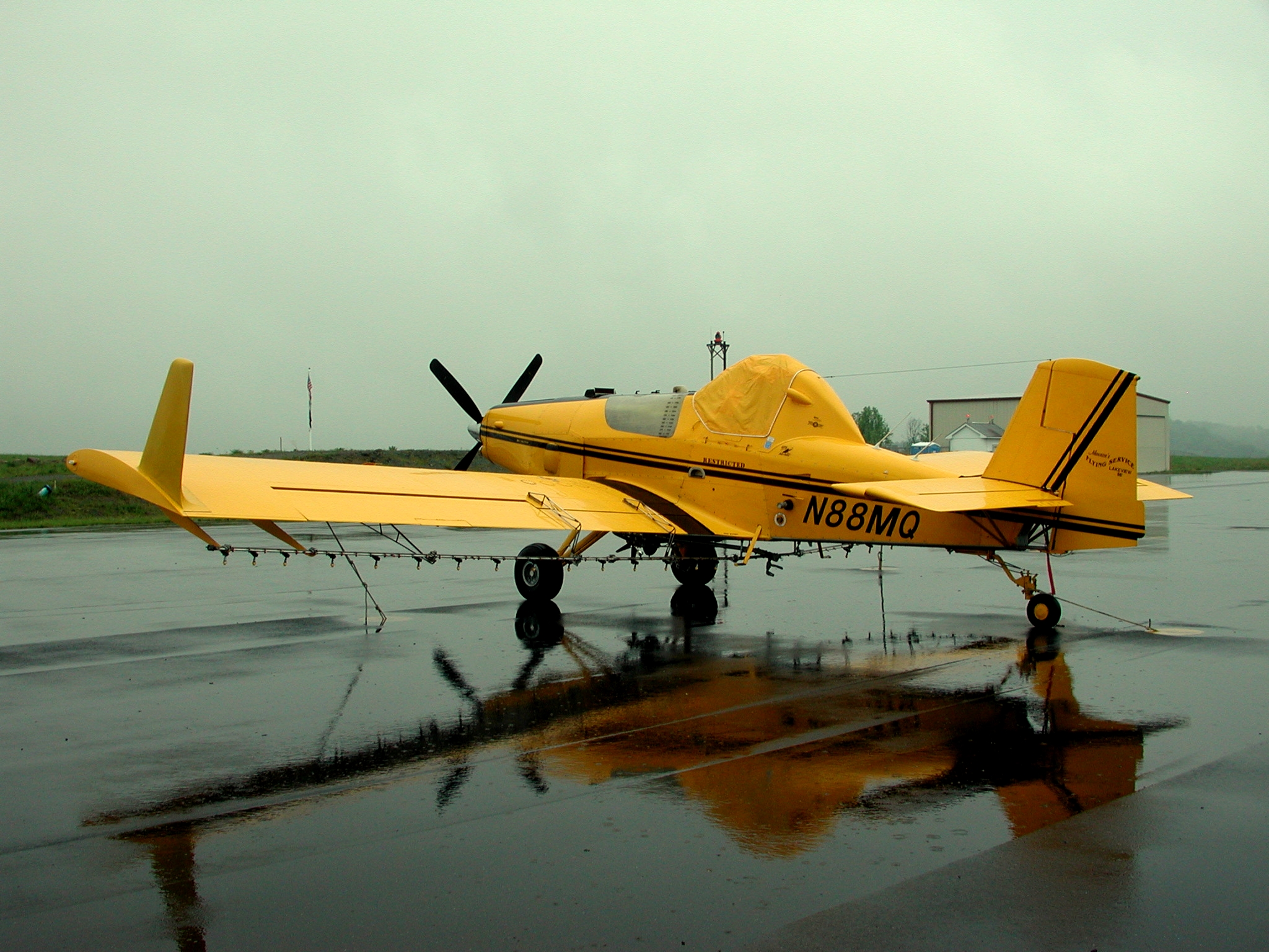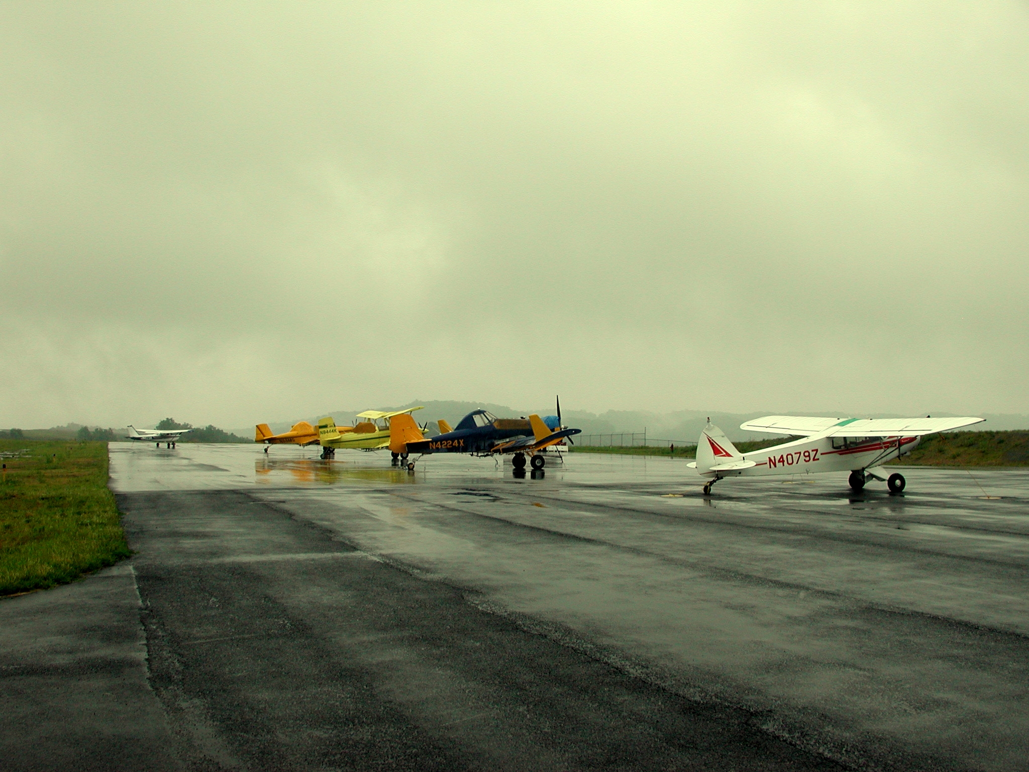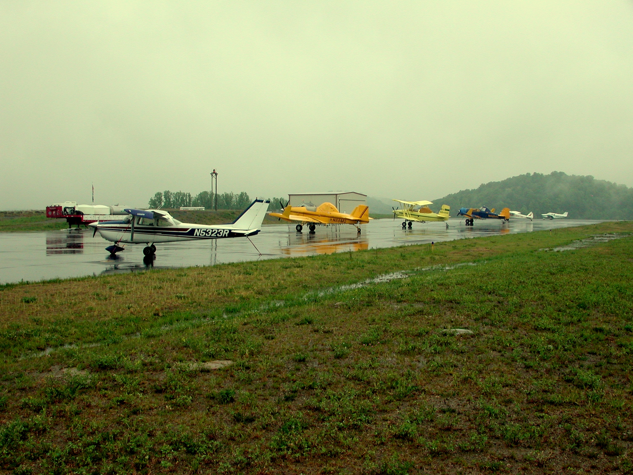 These pictures were taken on 5/16/2001, showing the fleet of aircraft temporarily based at UCRA while spraying surrounding counties for gypsy moth infestations, under contract to the WV Department of Natural Resources. Note that these high resolution images average between 1.6 and 1.9 megabytes in length, and may take significant time to download via dialup connections. Click on each icon to view, or right-click to download.